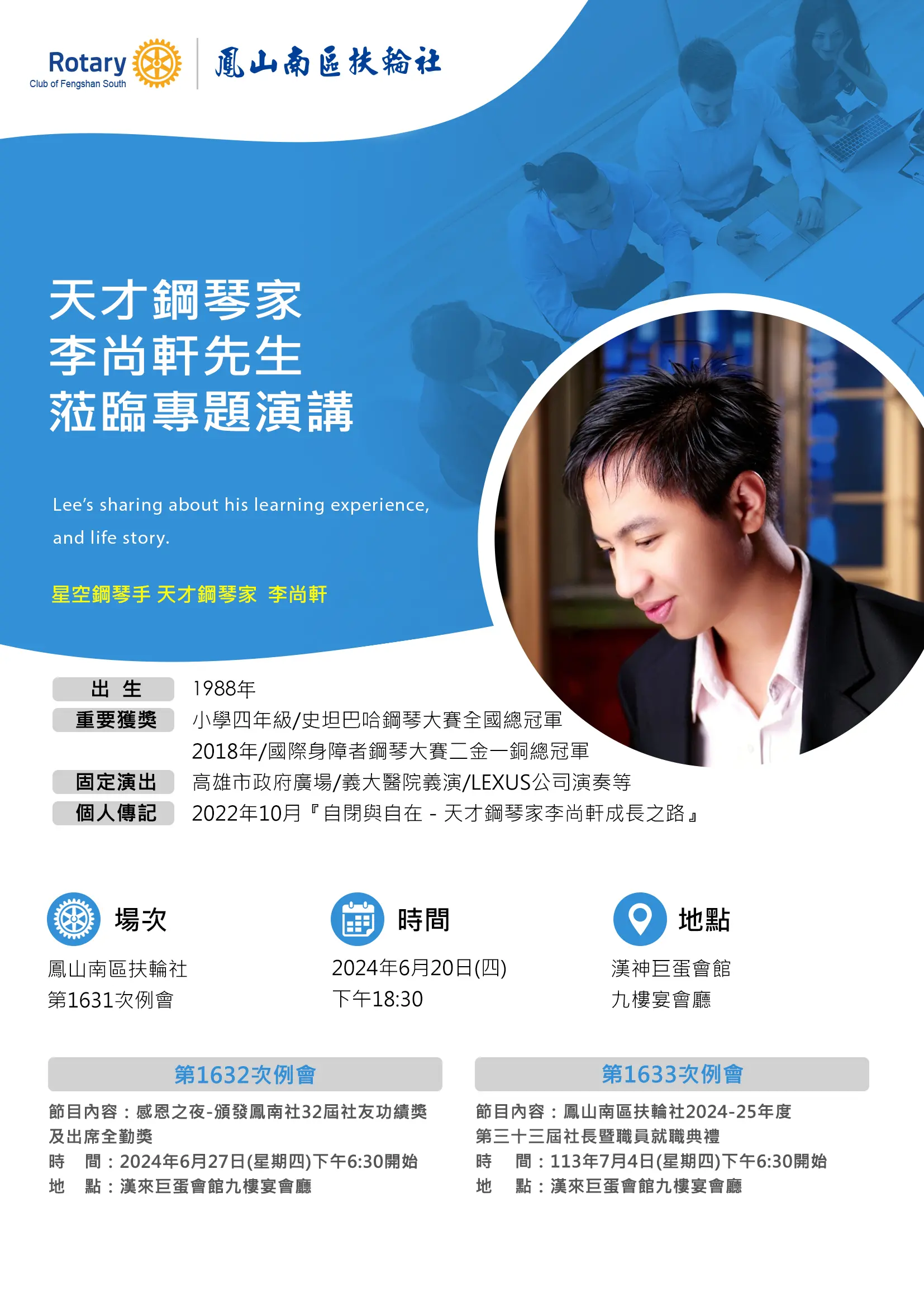 6/20(四) 天才鋼琴家 李尚軒先生蒞臨專題演講