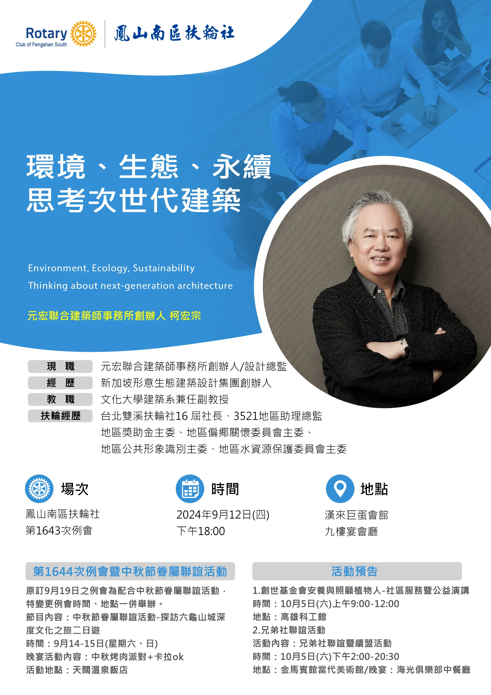 最新消息每週例會9/12(四) 元宏聯合建築創辦人柯宏宗建築師主講:環境、生態、永續,思考次世代建築 News每週例會 122024/09 9/12(四) 元宏聯合建築創辦人柯宏宗建築師主講:環境、生態、永續,思考次世代建築