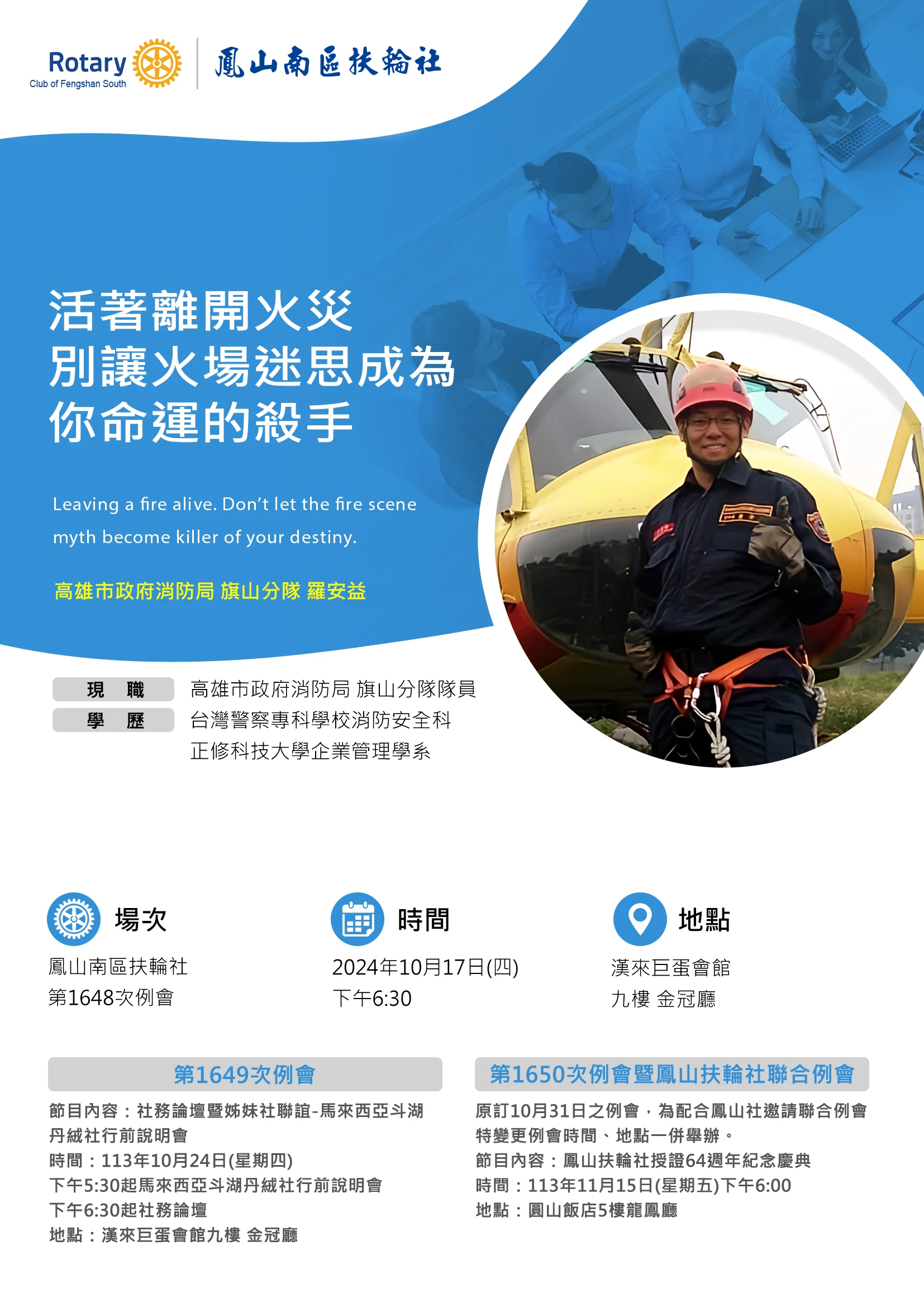 最新消息每週例會10/17(四)高市消防局旗山分隊羅安益主講:活著離開火災-別讓火場迷思成為你命運的殺手 News每週例會 172024/10 10/17(四)高市消防局旗山分隊羅安益主講:活著離開火災-別讓火場迷思成為你命運的殺手