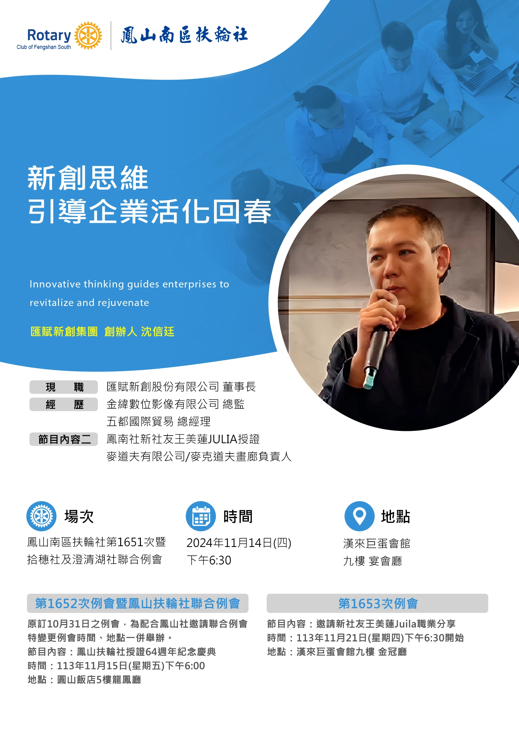 最新消息每週例會11/14(四)匯賦新創股份有限公司沈信廷董事長主講:新創思維引導企業活化回春 News每週例會 142024/11 11/14(四)匯賦新創股份有限公司沈信廷董事長主講:新創思維引導企業活化回春