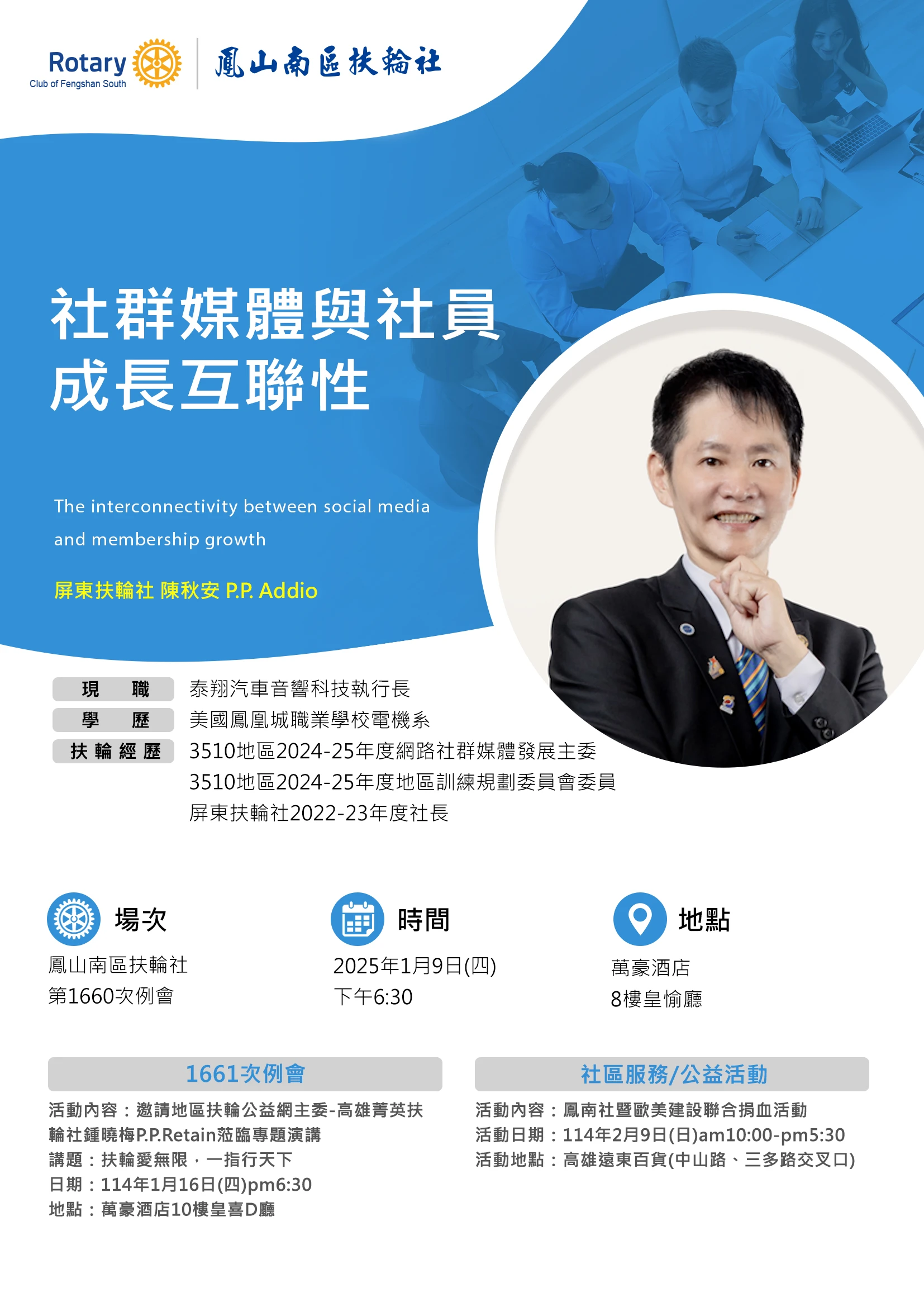 最新消息每週例會1/9(四)3510地區網路社群媒體發展主委-屏東社陳秋安P.P.Audio主講:社群媒體與社員成長互聯性 News每週例會 072025/01 1/9(四)3510地區網路社群媒體發展主委-屏東社陳秋安P.P.Audio主講:社群媒體與社員成長互聯性