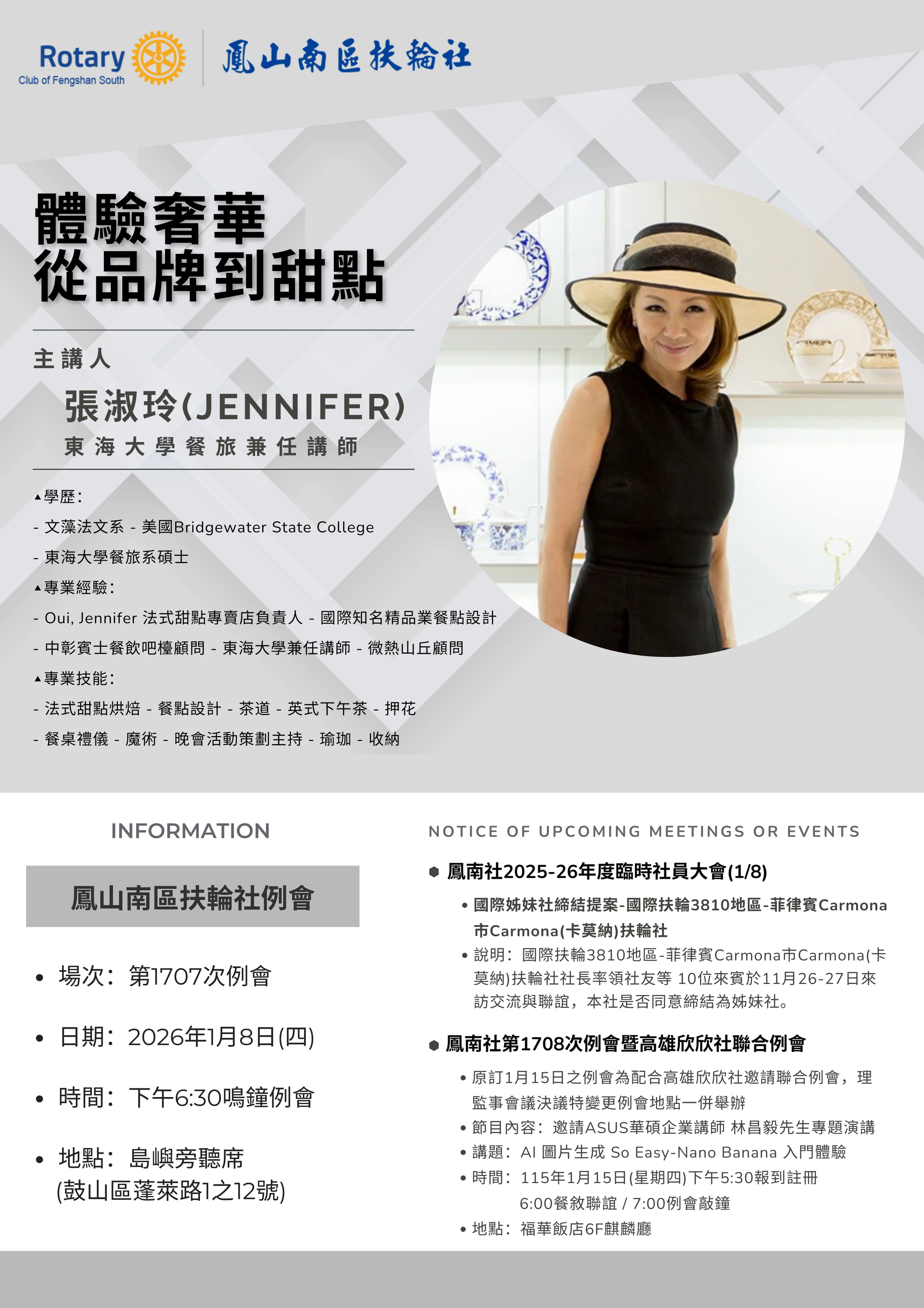 1/8(四)東海大學餐旅兼任講師張淑玲老師主講:體驗奢華-從品牌到甜點