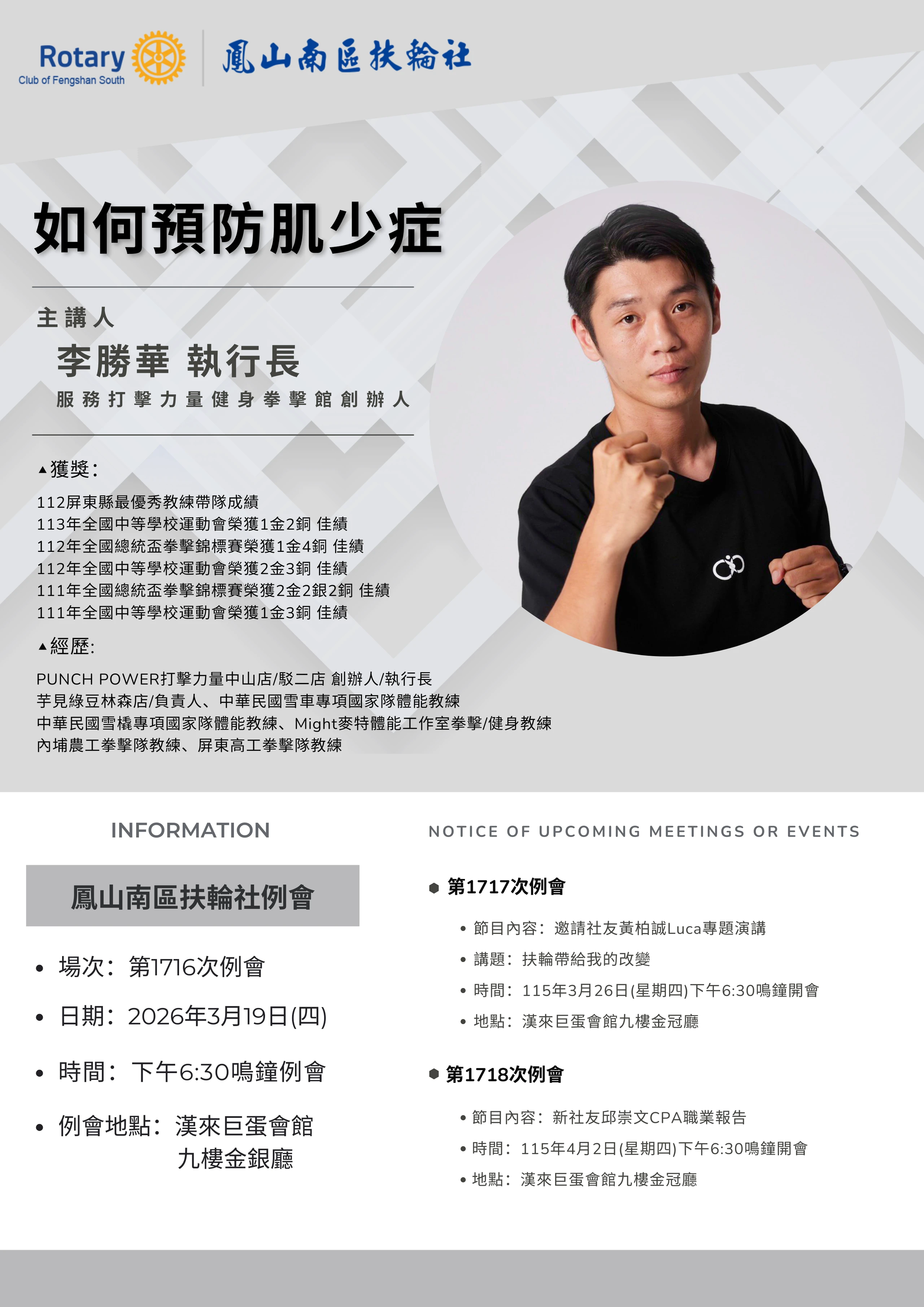 最新消息每週例會3/19(四)服務打擊力量健身拳擊館創辦人李勝華執行長主講:如何預防肌少症 News每週例會 192026/03 3/19(四)服務打擊力量健身拳擊館創辦人李勝華執行長主講:如何預防肌少症